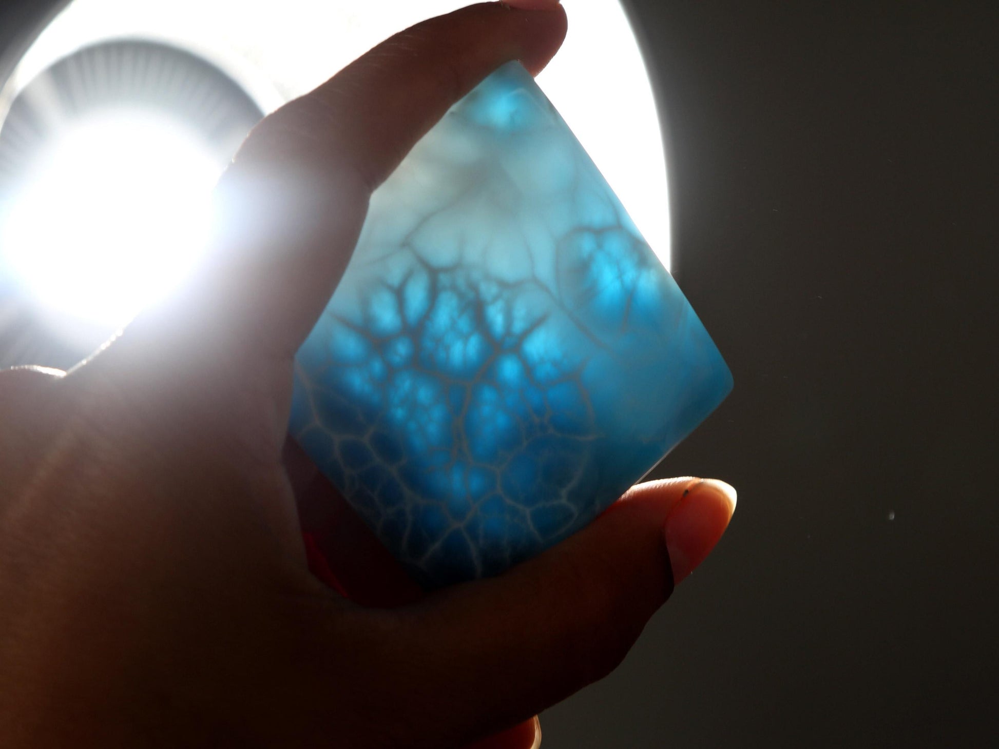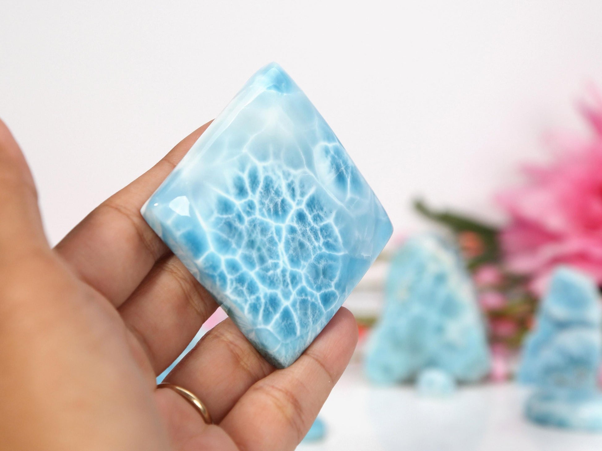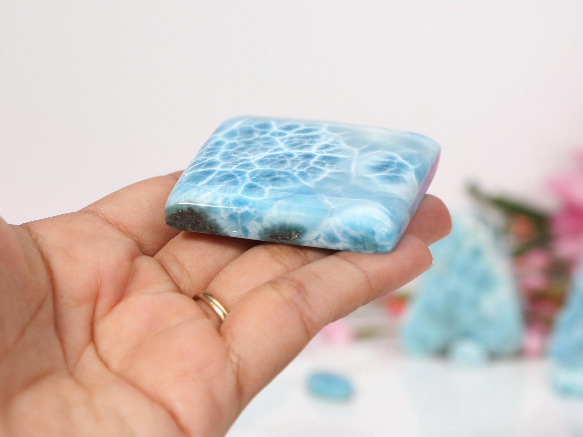 Une pierre de larimar de qualité supérieure, ornée d'un motif impressionnant évoquant l'océan. Elle complétera à merveille votre collection de cristaux ou vous accompagnera lors de vos séances de méditation.