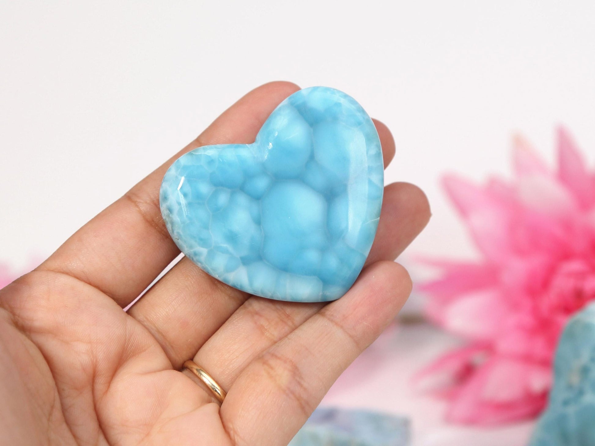 A beautiful cerulean-blue larimar heart that displaying a beautiful pattern. It is a perfect addition to your crystal collection or to be used for your meditation needs. 📐Dimensions: 1.7" long X 1.9" wide (45 mm x 50 mm) Weight: 40 grams Please allow a minor variance 📜 You will also receive an information card about the stone.