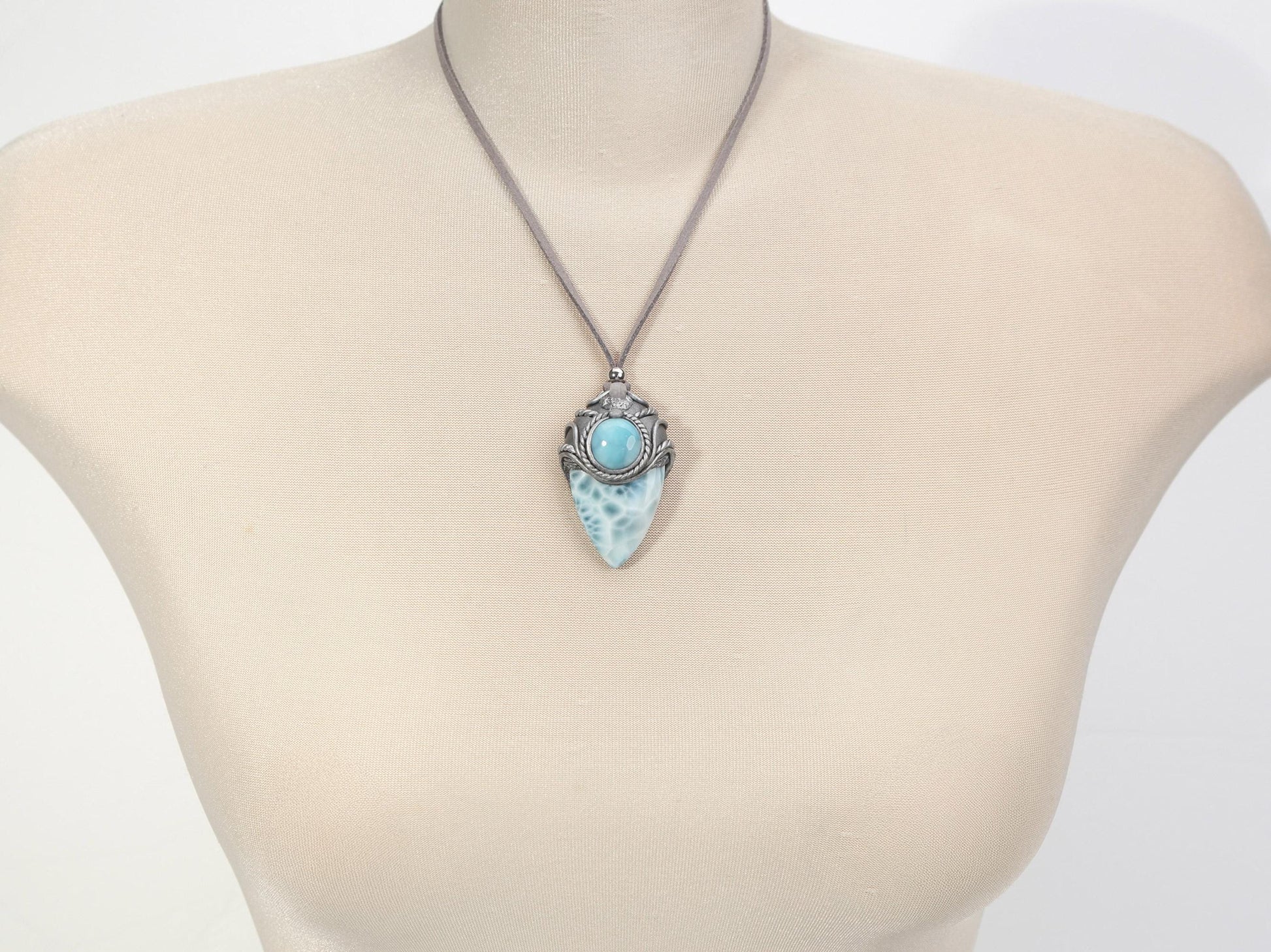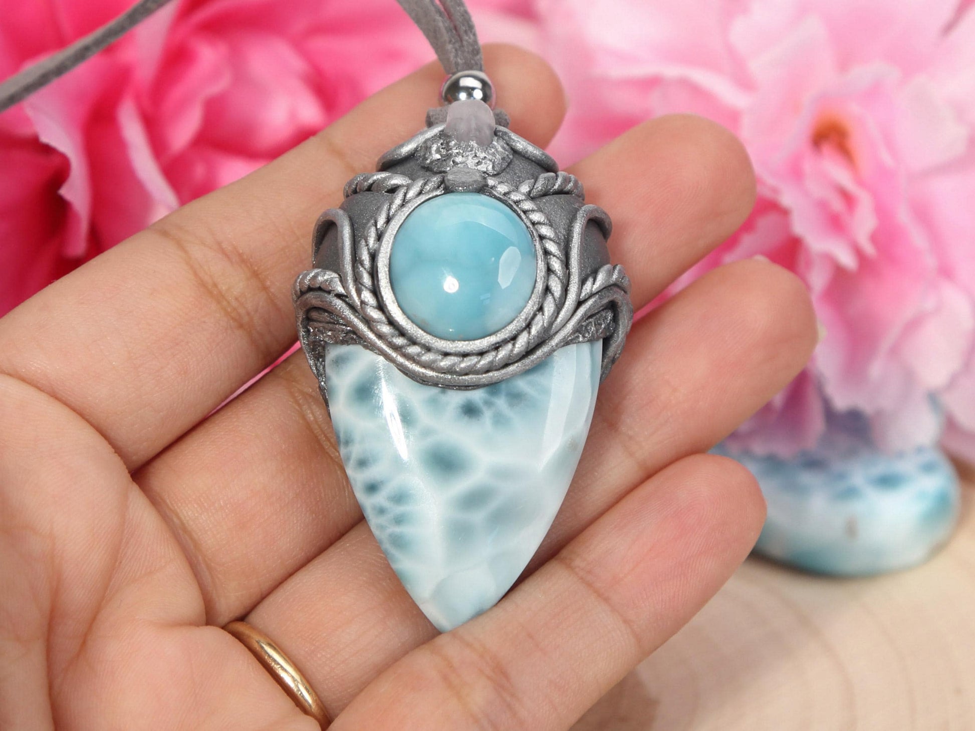Featuring a beautiful combination of two beautiful Larimar stones and a tiny raw Amethyst stone, this pendant is carefully handcrafted using durable polymer clay. It comes with an adjustable faux suede cord or you can pair it with a stainless steel for an extra fee. Gemstones and Material: Larimar and a tiny raw Amethyst / Set in Polymer Clay 📐 Dimensions: 1.7" long X 0.9" wide (44mm x 25 mm), including the bail. Please allow a minor variance Important: Although made with sturdy polymer clay, your piece still needs to be treated with care. Please keep it dry to maintain its original charm. 🎁 Your piece comes in a beautiful gift box.