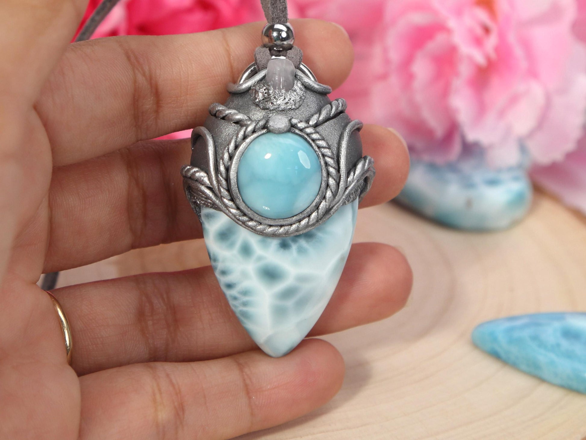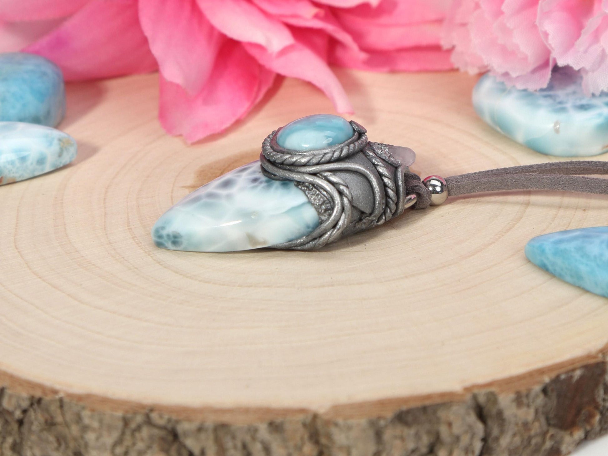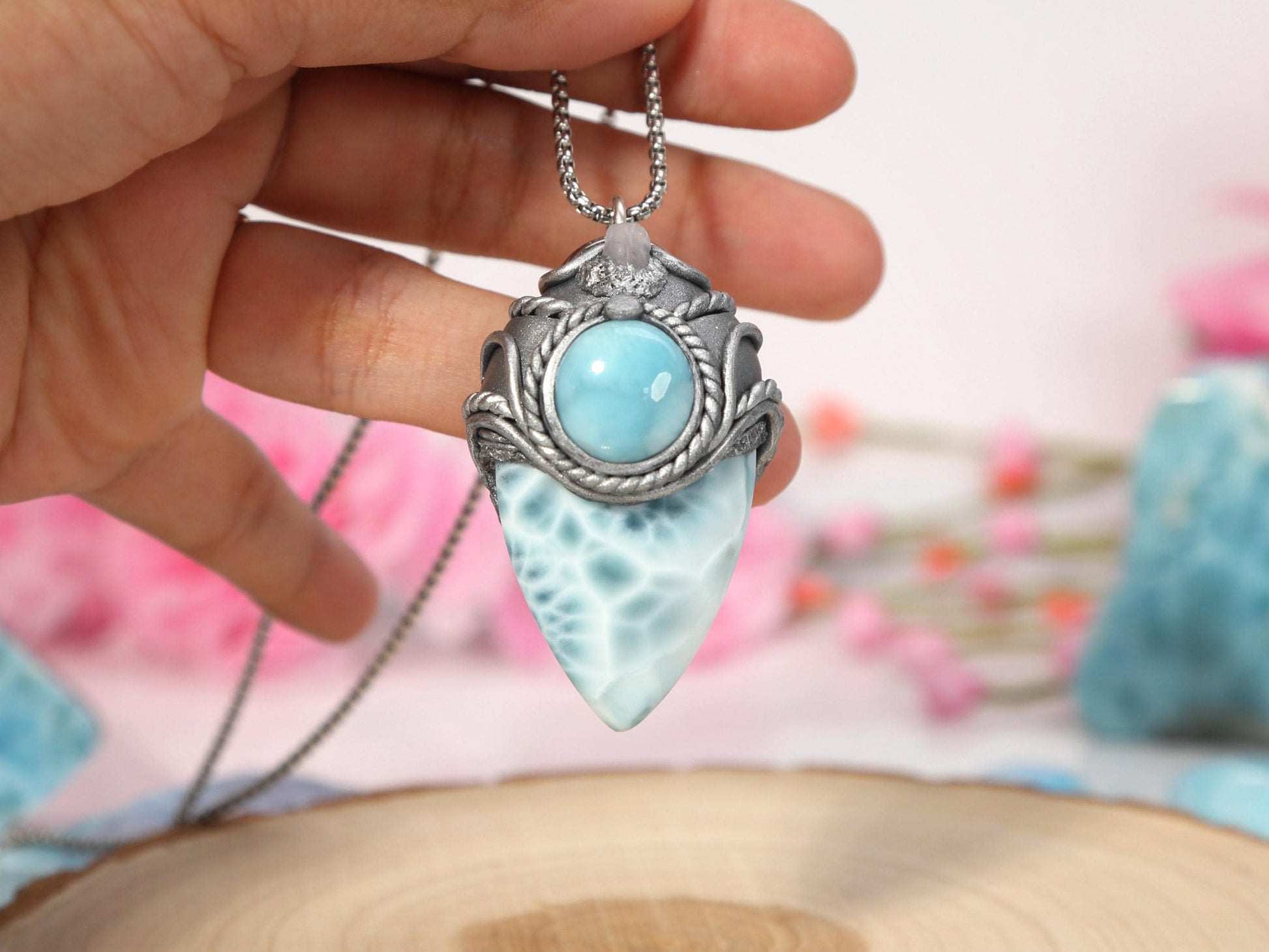 Double Larimar Stone Pendant, Polymer Clay, Crystal Talisman Pendant Necklace, Ocean Blue Larimar, Christmas gift