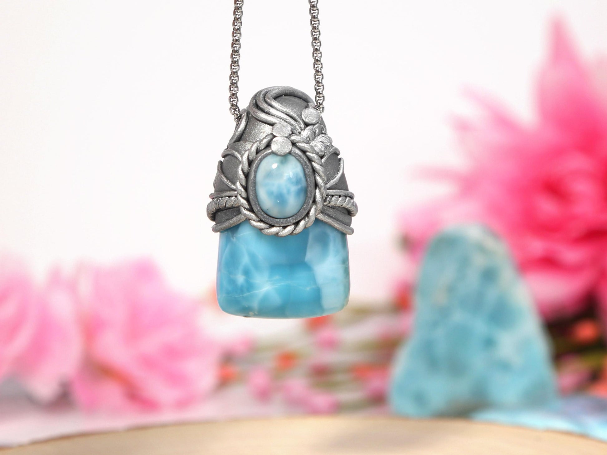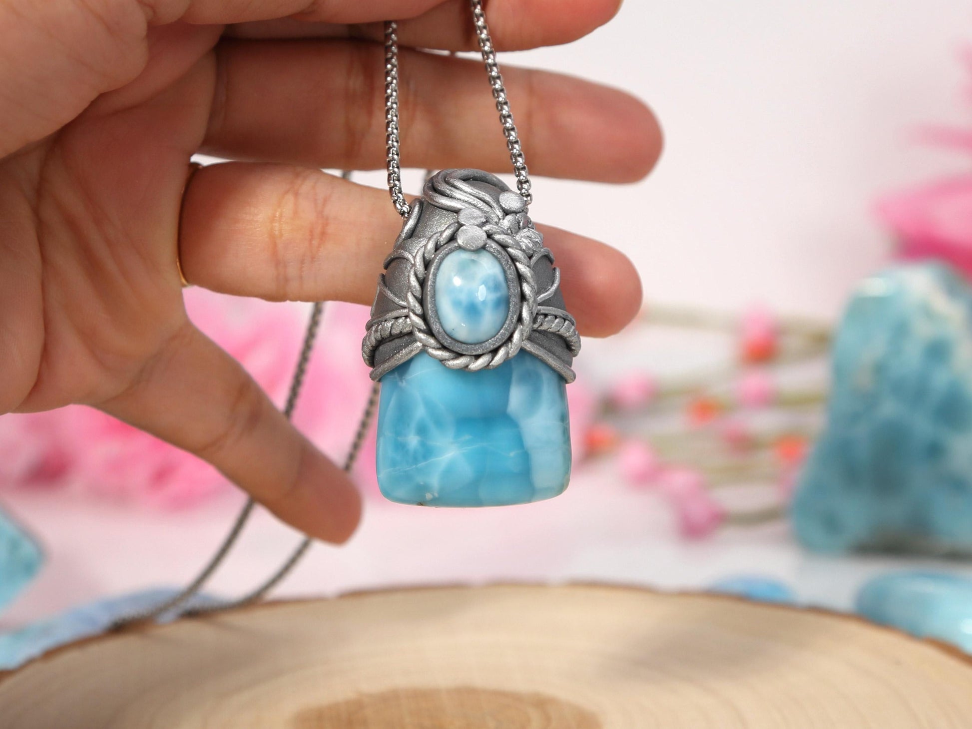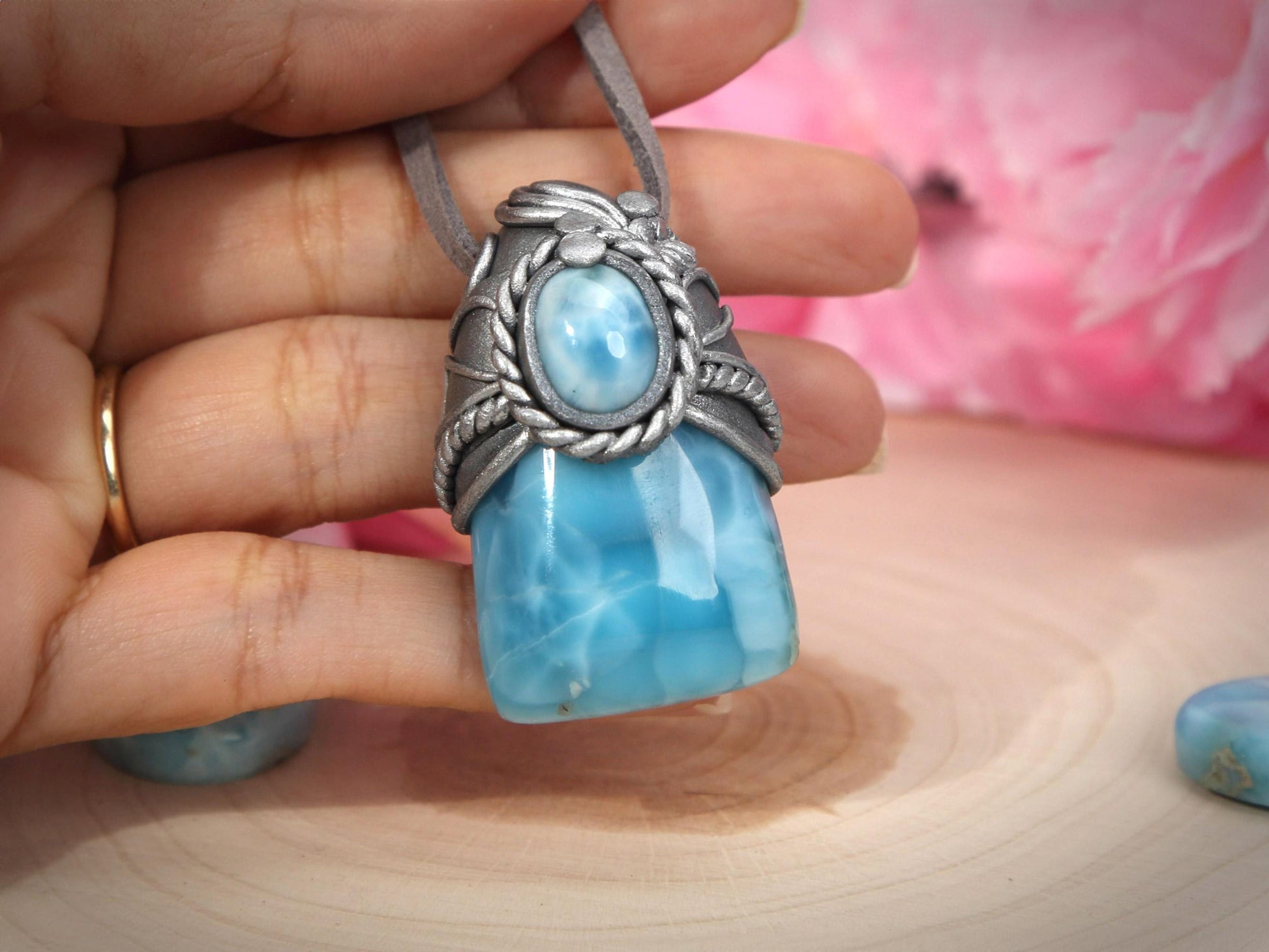 Double Larimar Stone Pendant, Polymer Clay, Crystal Talisman Pendant Necklace, Ocean Blue Larimar, Christmas gift
