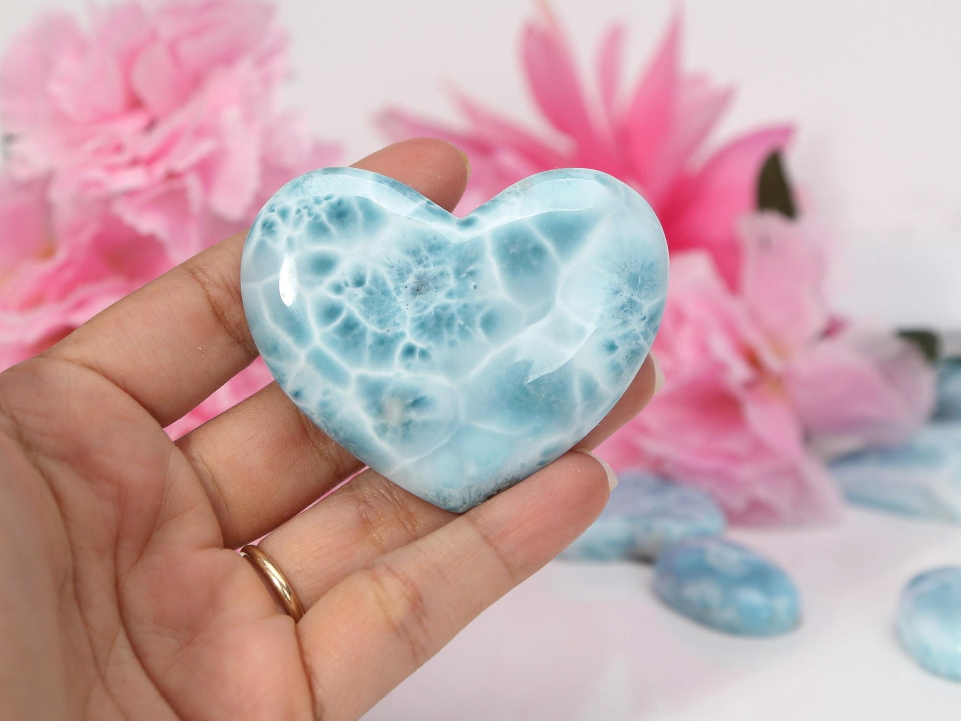 Pure beauty, this exquisite larimar heart displays an oceanic pattern and beautiful blue hues. It is a perfect piece for your crystal collection. 📐Dimensions: 2" long X 2.4" wide (52 mm x 63 mm) Weight: 62 grams Please allow a minor variance 📜 You will also receive an information card about the stone.