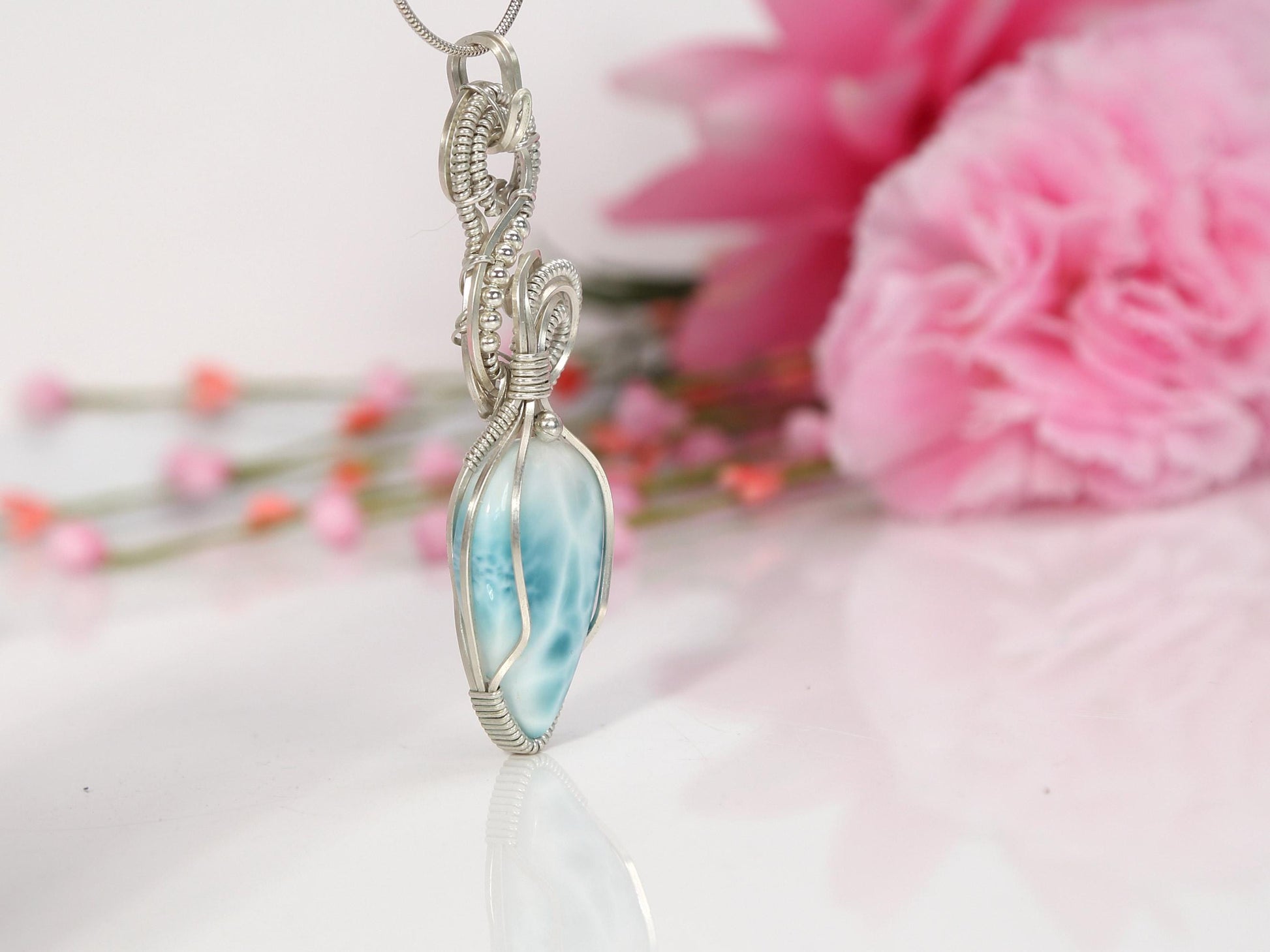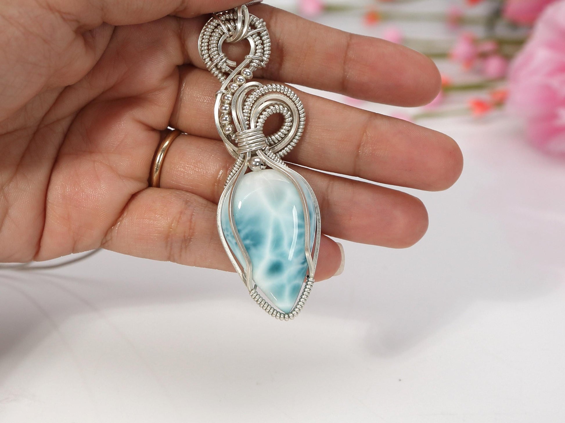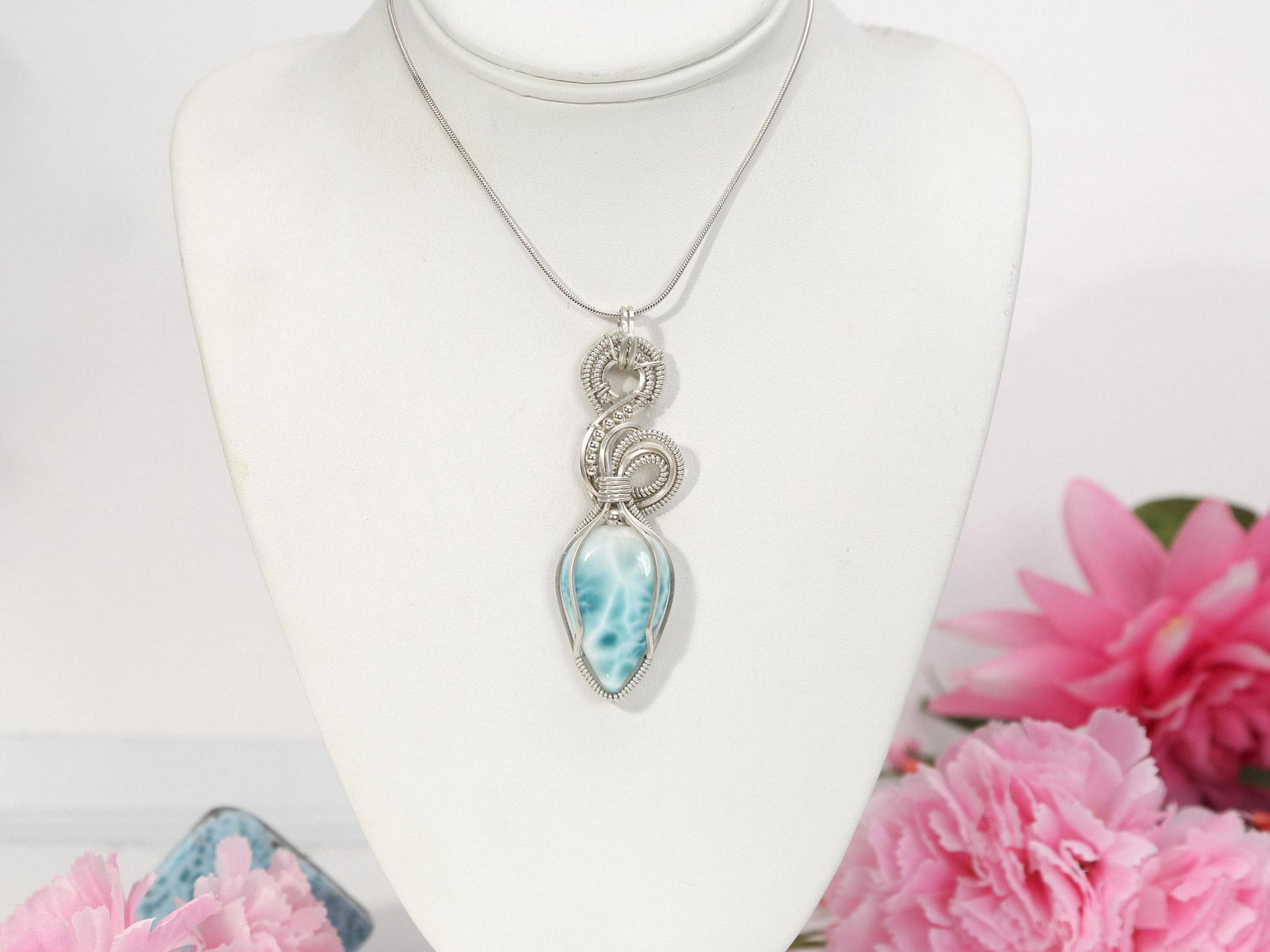 This unique Larimar stone is delicately wrapped in Argentium and Sterling Silver and displayes a harmonious design of spirals. Gemstone and Material: Larimar wire-wrapped in ethically-sourced Argentium Silver 935 and Sterling Silver 925 2.3" long X 0.9" wide (76 mm x 24 mm), including the bail. Weight: 23 grams. Please allow a minor variance ⛓️ Optional Chain: You can add a sterling silver snake chain to pair with this beautiful pendant for an extra fee. 🎁 Your piece comes in a beautiful gift box.