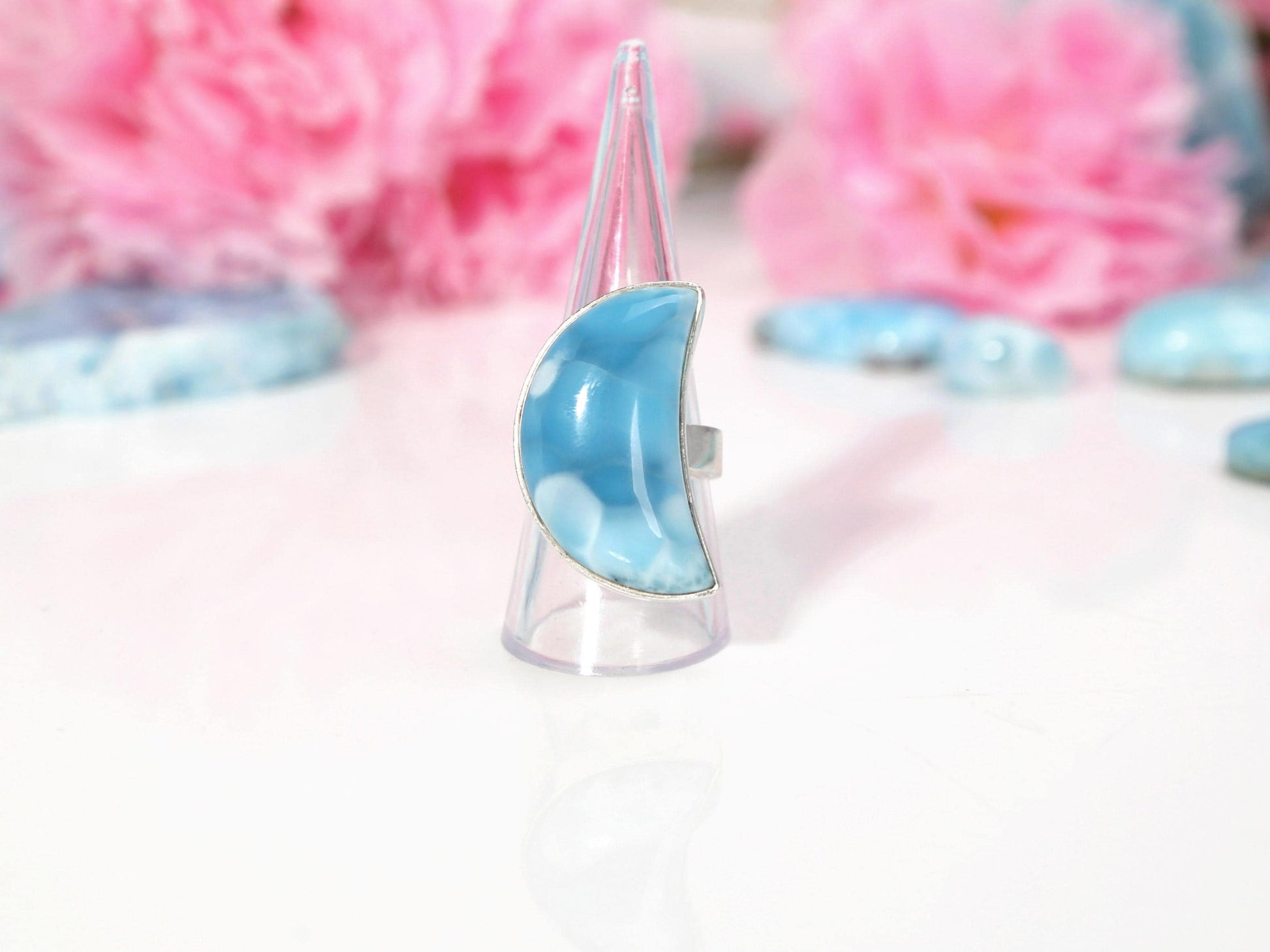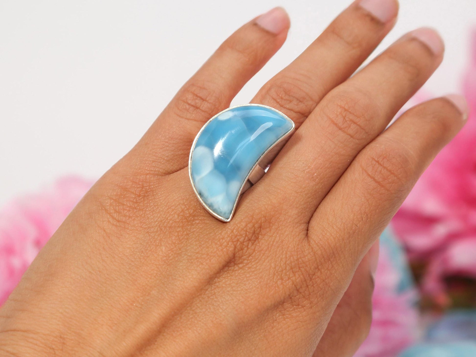 This vibrant half-moon Larimar ring features a top-grade Larimar gemstone displaying beautiful blue hues. It is set in Sterling Silver 925. π Dimensions: Ring size: 8.5 1.3" long X 0.7" wide (33mm x 17 mm) Weight: 19 grams Please allow a minor variance π Your piece comes in a beautiful gift box.Β