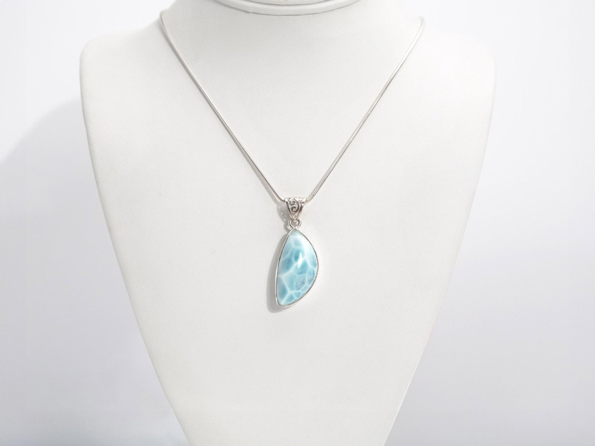 A captivating pendant featuring a top-quality larimar stone with a freeform design. The true star is the larimar stone itself, with its surface displaying a mesmerizing turtleback pattern. Gemstone and Material: Larimar set in Sterling Silver 925 📐 Dimensions: 1.7" long X 0.6" wide (43 mm x 16 mm), including the bail. Weight: 12 grams Please allow a minor variance ⛓️ Optional Chain: You can add a sterling silver snake chain to pair with this beautiful pendant for an extra fee. 🎁 Your piece comes in a beautiful gift box.