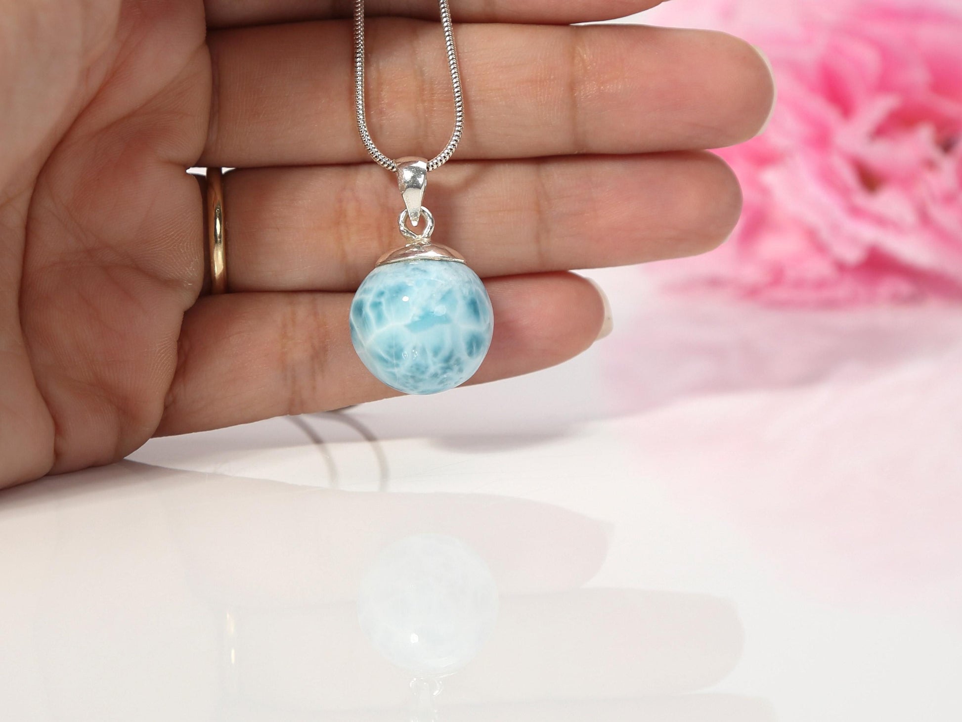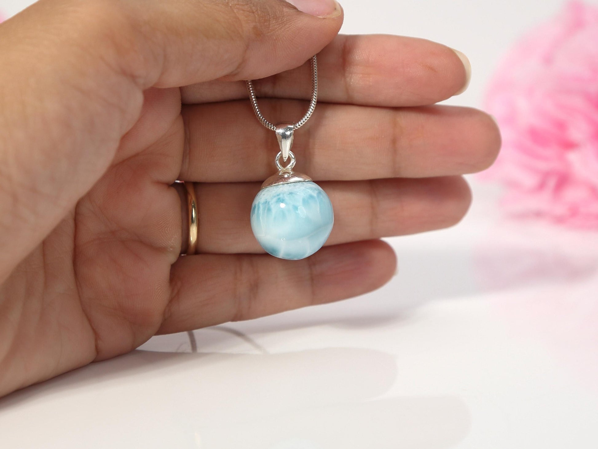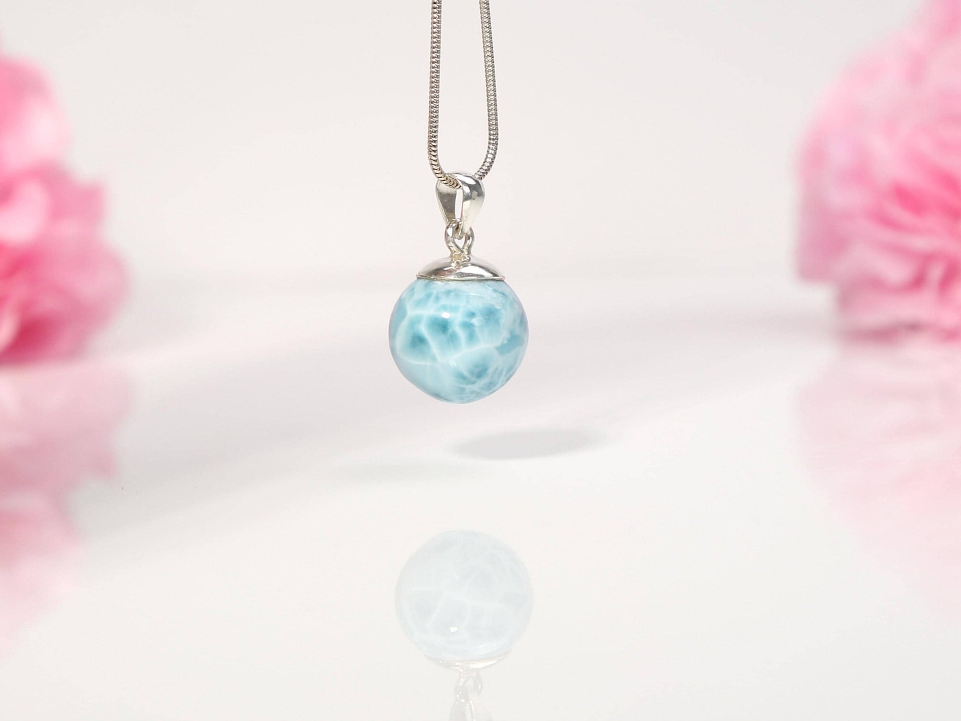 Ocean-Blue Larimar Sphere Pendant Necklace: AAA 925 Sterling Silver, Christmas gift